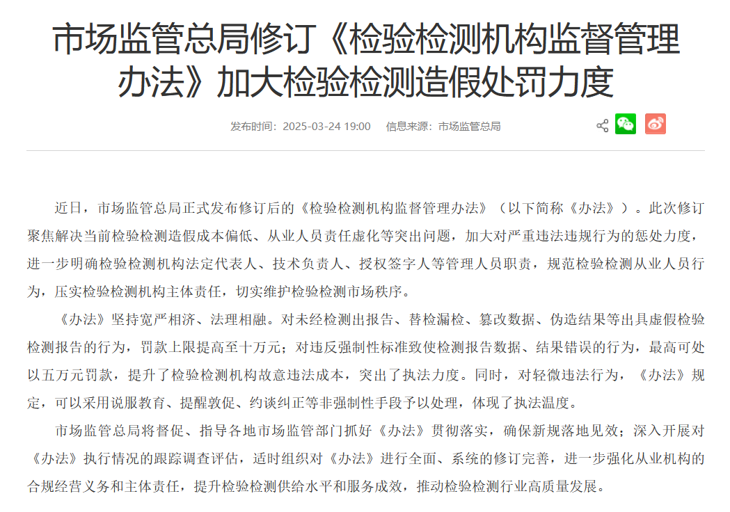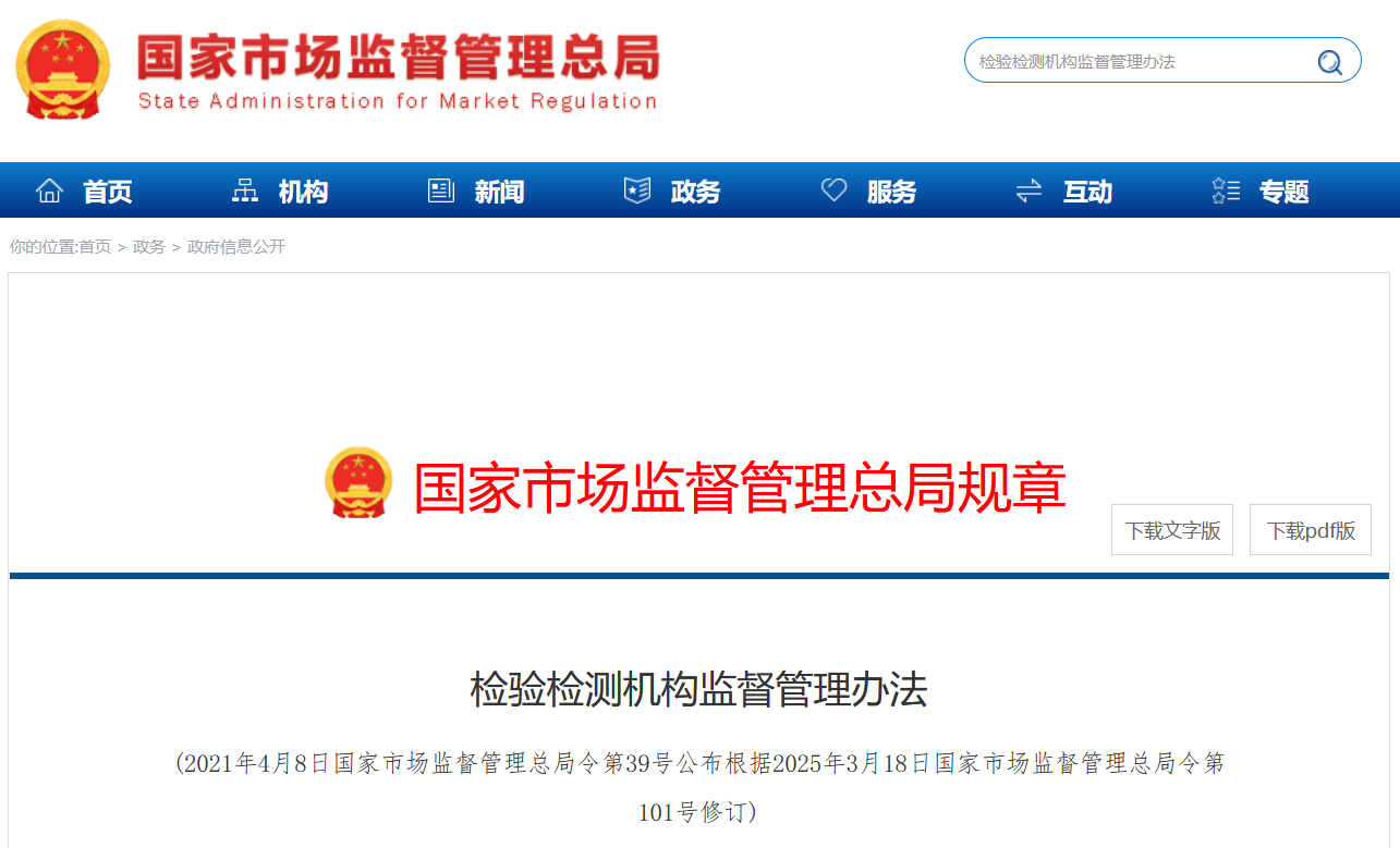 市場監管總局正式發布修訂后的《檢驗檢測機構監督管理辦法》第一條 為了加強檢驗檢測機構監督管理工作,規范檢驗檢測機構從業行為,營造公平有序的檢驗檢測市場環境,依照《中華人民共和國計量法》及其實施細則、《中華人民共和國認證認可條例》等法律、行政法規,制定本辦法。第二條 在中華人民共和國境內檢驗檢測機構從事向社會出具具有證明作用的檢驗檢測數據、結果、報告(以下統稱檢驗檢測報告)的活動及其監督管理,適用本辦法。法律、行政法規對檢驗檢測機構的監督管理另有規定的,查看詳情>>
