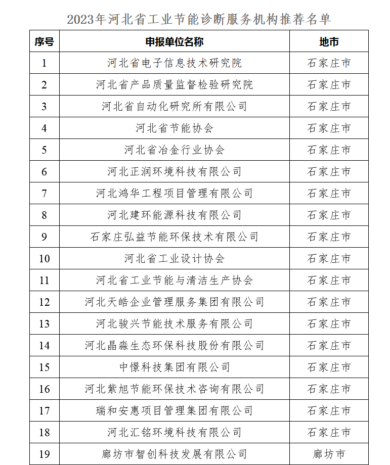 河北冀鑒入圍我省2023年度工業節能診斷服務機構名單河北省工業和信息化廳關于2023年河北省工業節能診斷服務機構推薦名單的公示 經企業申報、各市推薦和專家審核,擬將河北省電子信息技術研究院等52家單位做為2023年河北省工業節能診斷服務機構推薦名單,現予公示。公示期間如有異議,請實名以書面形式向我廳提出。 公示時間:6月16日至6月25日 聯系電話:0311-87800807 87801583(傳真) 附件:2023年河北省工業節能診斷服務查看詳情>>