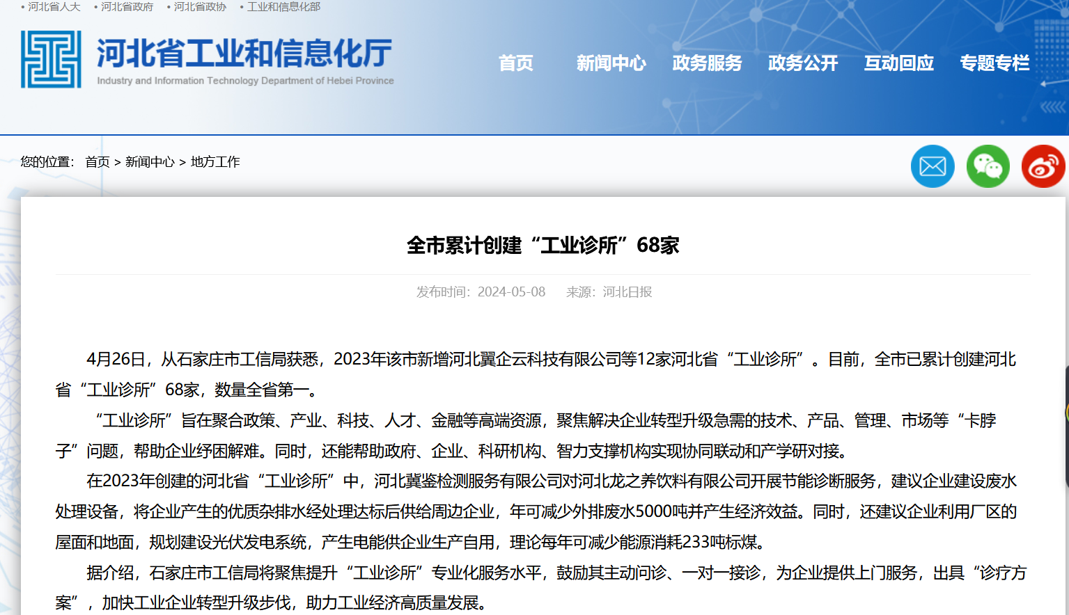 河北冀鑒檢測服務有限公司工業診所工作獲得上級表揚工業診所”旨在聚合政策、產業、科技、人才、金融等高端資源,聚焦解決企業轉型升級急需的技術、產品、管理、市場等“卡脖子”問題,幫助企業紓困解難。同時,還能幫助政府、企業、科研機構、智力支撐機構實現協同聯動和產學研對接。 在2023年創建的河北省“工業診所”中,河北冀鑒檢測服務有限公司對河北龍之養飲料有限公司開展節能診斷服務,建議企業建設廢水處理設備,將企業產生的優質雜排水經處理達標后供給周邊企業,查看詳情>>