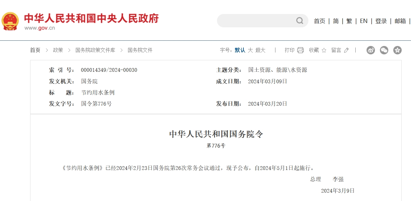 節約用水條例將于5月1日實施中華人民共和國國務院令第776號《節約用水條例》已經2024年2月23日國務院第26次常務會議通過,現予公布,自2024年5月1日起施行。總理 李強 2024年3月9日 節 約 用 水 條 例第一章 總 則第一條 為了促進全社會節約用水,保障國家水安全,推進生態文明建設,推動高質量發展,根據《中華人民共和國水法》等有關法律,制定本條例。第二條 本條例所稱節約用水(以下簡稱查看詳情>>