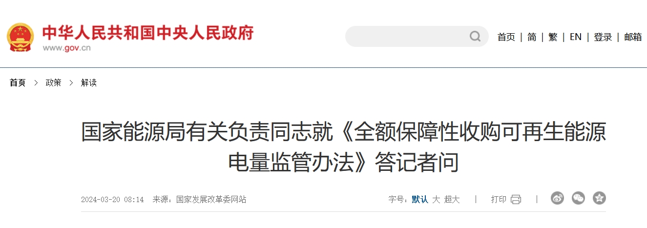 國家能源局有關負責同志就《全額保障性收購可再生能源電量監管辦法》答記者問國家發展改革委于印發了《全額保障性收購可再生能源電量監管辦法》(以下簡稱《辦法》),國家能源局有關負責同志接受采訪,回答了記者提問。 問:《辦法》印發的背景是什么? 答:原國家電力監管委員會于2007年9月1日印發施行《電網企業全額收購可再生能源電量監管辦法》(國家電力監管委員會令第25號),有效規范可再生能源電量保障收購行為,為推動可再生能源規模化健康發展,實現清潔低碳發展目標發揮了重要作用查看詳情>>