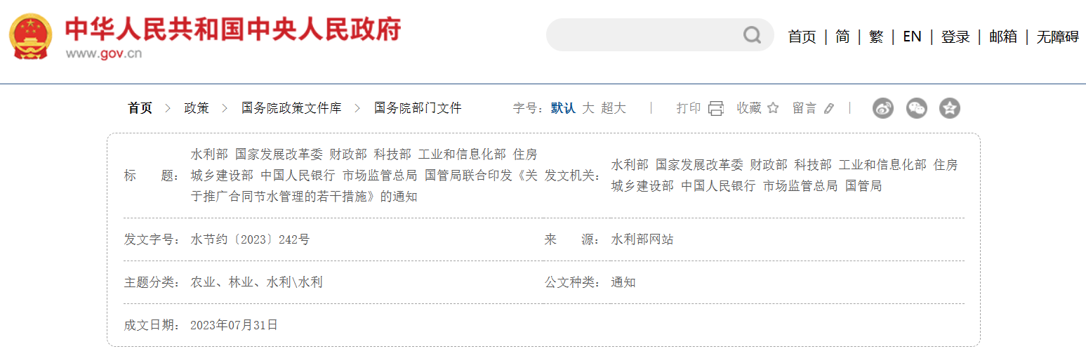 水利部 國家發展改革委 財政部等聯合印發《關于推廣合同節水管理的若干措施》水利部 國家發展改革委 財政部 科技部 工業和信息化部 住房城鄉建設部 中國人民銀行 市場監管總局 國管局聯合印發《關于推廣合同節水管理的若干措施》的通知水節約〔2023〕242號各省、自治區、直轄市水利(水務)廳(局)、發展改革委、財政廳(局)、科技廳(委、局)、工業和信息化主管部門、住房城鄉建設廳(委、管委、局)、人民銀行上海總部、各分行、營業管理部、各省會(首府)城市中心支行、各副省級城市中查看詳情>>