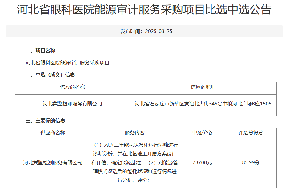 中標喜報憑借良好的信譽、行業(yè)經(jīng)驗、堅實的技術能力及優(yōu)秀的方案,我公司最終順利中標“河北省眼科醫(yī)院能源審計服務采購項目”。 風起云涌新時代,破浪前行正當時。河北冀鑒檢測服務有限公司將緊抓機遇,迎接挑戰(zhàn),不斷提升審計服務水平。查看詳情>>
