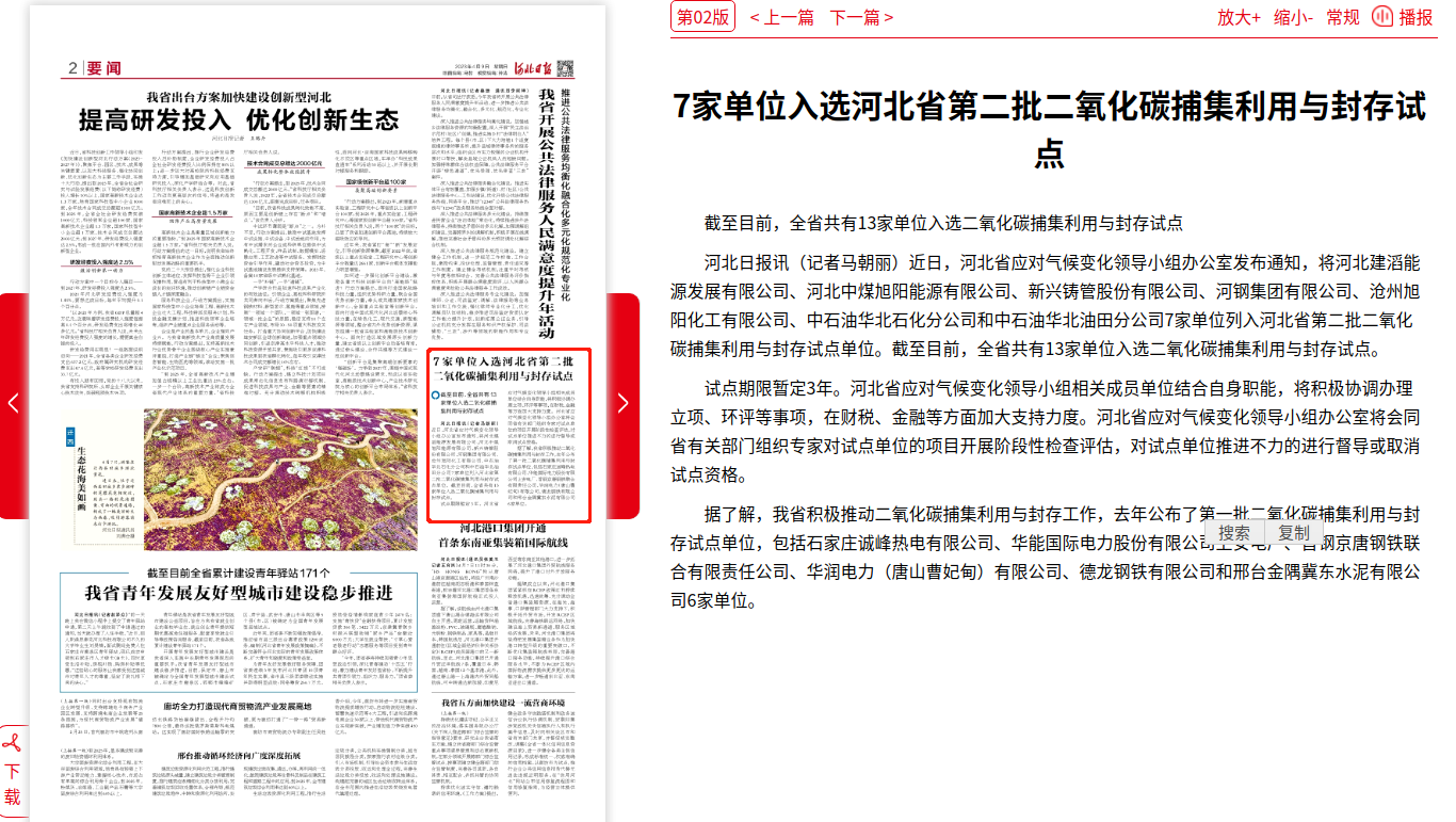 據了解,我省積極推動二氧化碳捕集利用與封存工作,去年公布了第一批二氧化碳捕集利用與封存試點單位,包括石家莊誠峰熱電有限公司、華能國際電力股份有限公司上安電廠、首鋼京唐鋼鐵聯合有限責任公司、華潤電力(唐山曹妃甸)有限公司、德龍鋼鐵有限公司和邢臺金隅冀東水泥有限公司6家單位。